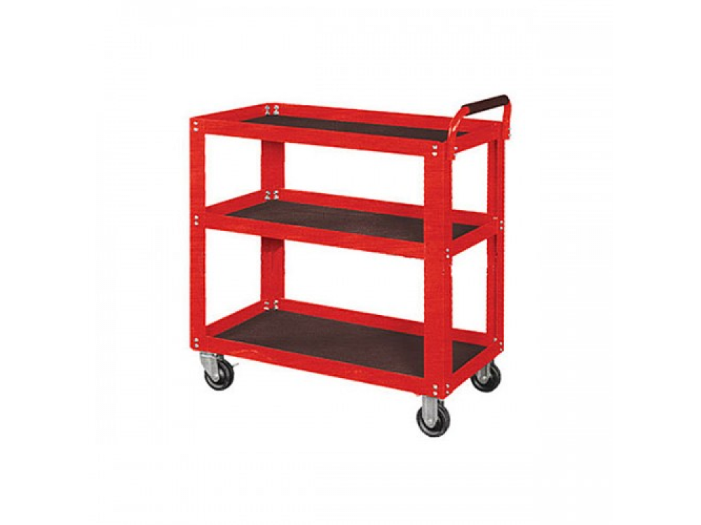 Тележка открытая, 3 полки, красная МАСТАК 520-33720R предназначена для компактного размещения, хранения и перемещения по ремонтному цеху ручного слесарного инструмента и чаще всего используются как готовый инструментарий для слесарного участка. Особенности: - изготавливается из цельного листового, усиленного металла; - усиленные ребра жесткости, выдерживающие нагрузку до 30 кг; - ударо-масло-влагостойкое порошковое покрытие; - одна пара колес вращается вокруг своей оси и снабжена тормозом.